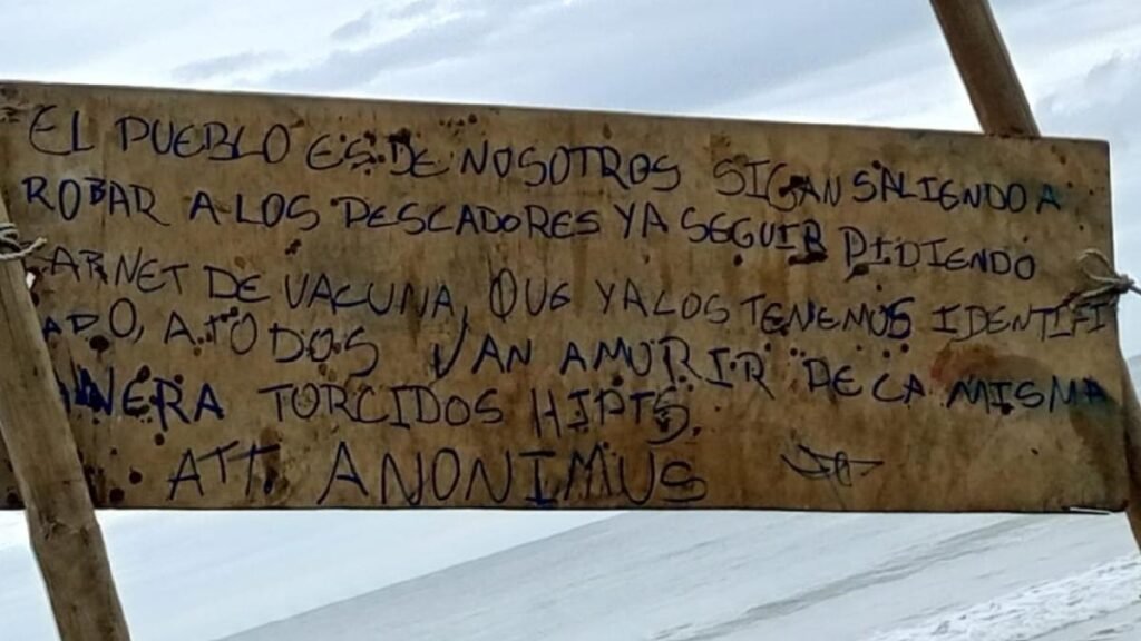 Junto a las cabezas decapitadas se halló un letrero con una advertencia escrita. De acuerdo con información preliminar, el mensaje estaría dirigido contra extorsionadores vinculados al sector pesquero.