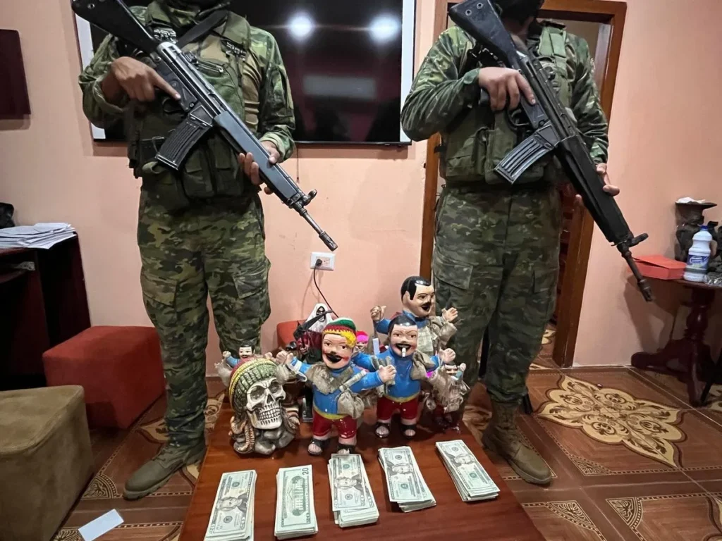 Asimismo, hallaron USD 9 160 en efectivo. Además, identificaron un altar de la Santa Muerte y siete altares adicionales utilizados en prácticas espirituales. Estas evidencias fueron incorporadas a la cadena de custodia para el respectivo proceso judicial.