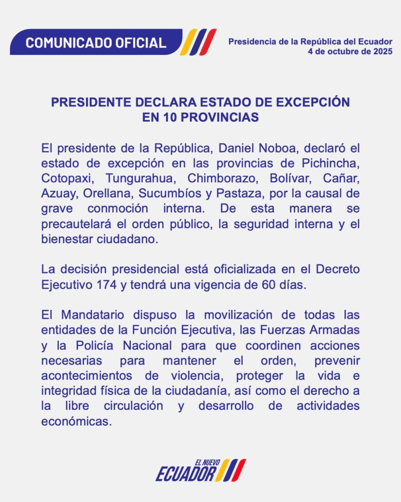 El Decreto Ejecutivo 174 oficializa el estado de excepción en diez provincias con una vigencia de 60 días. La medida se fundamenta en los hechos de violencia ocurridos durante el paro nacional, que han alterado el orden público y puesto en riesgo derechos fundamentales como la vida, integridad y libertad de circulación.