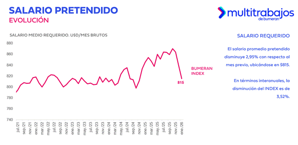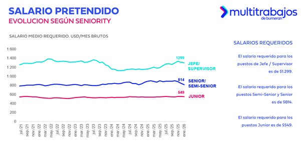 En enero, el salario promedio requerido en roles de jefe o supervisor fue de USD 1.299, registrando un decrecimiento del 0,85% en comparación con el mes previo. Para las posiciones semi senior y senior, fue de USD 814, con un descenso del 3,96% con relación a diciembre del 2025. En los niveles junior, el salario pretendido se situó en USD 549, lo que indica una baja del 1,22% respecto al mes anterior.