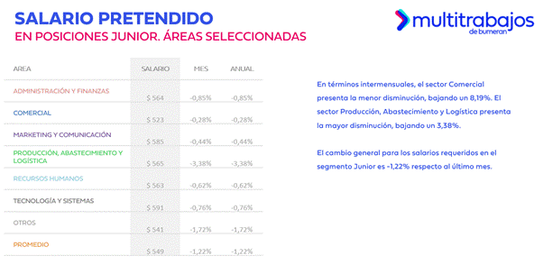 En el nivel junior, el área de Tecnología y Sistemas registra el salario pretendido más alto, alcanzando los USD 591, seguida de Marketing y Comunicación, cuya expectativa salarial se ubicó en USD 585. En contraste, el área Comercial presenta el salario pretendido más bajo, situándose en USD 523.