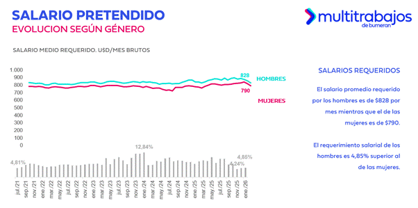 Las cifras correspondientes a enero de 2026 revelan que la brecha de los salarios promedio según género es de 4,85% a favor de los varones. En enero, el salario solicitado promedio fue de USD 828 y de USD 790 para hombres y mujeres, respectivamente.