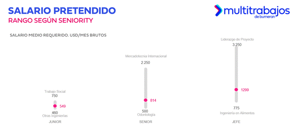 En contraste, en el segmento jefe o supervisor, el puesto de Ingeniería en Alimentos registra el salario pretendido más bajo, con USD 775. En el nivel semi senior y senior, el rol de Odontología muestra la menor pretensión salarial, situándose en USD 500. Para los niveles junior, la posición de Otras Ingenierías registra la expectativa salarial más baja, con USD 460.