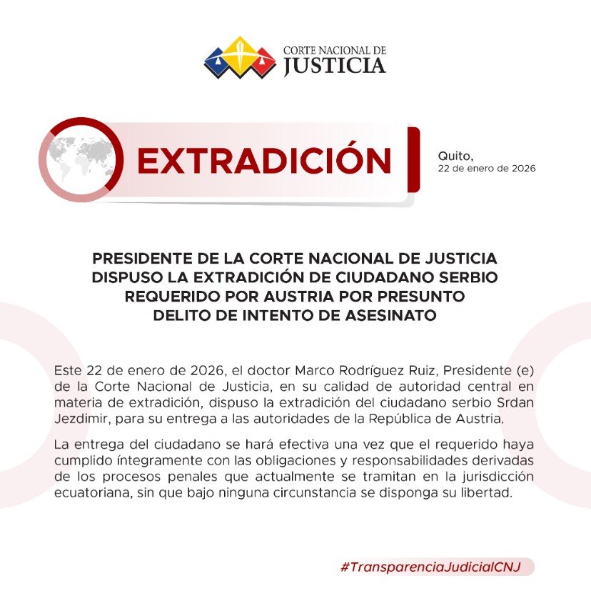 Jezdimir Srdan será extraditado a Austria tras cumplir sus penas en Ecuador, luego de que la Corte Nacional de Justicia aceptara el pedido presentado por ese país europeo. La resolución fue emitida la mañana del 22 de enero de 2026 por el juez Marco Rodríguez. Sin embargo, la entrega quedó expresamente condicionada al cumplimiento total de las condenas y procesos penales vigentes en territorio ecuatoriano.