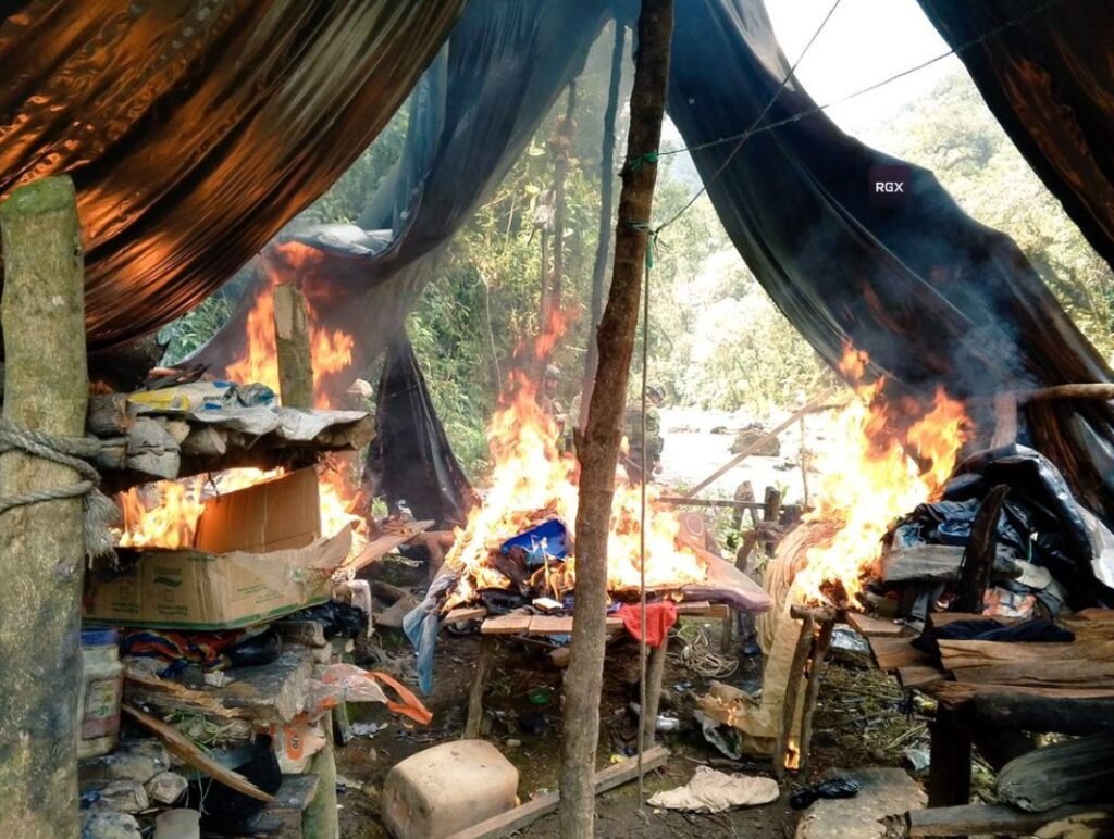Militares destruyen campamentos de minería ilegal en un contexto de mayor intervención estatal contra actividades ilícitas. En los últimos años, la minería ilegal se ha convertido en una amenaza ambiental y económica para varias regiones del país.